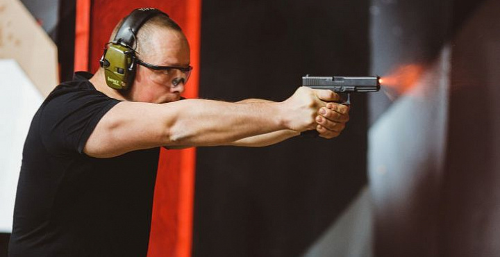 Фото прицельной стрельбы из пистолета в тире по мишеням